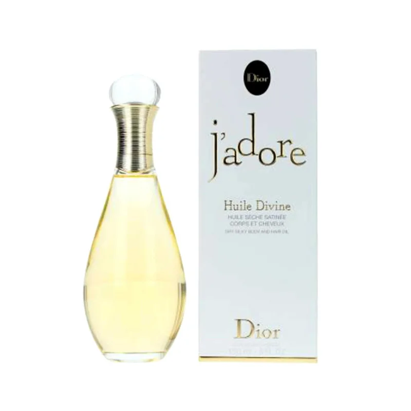 Óleo seco para corpo, cabelos e unhas, J’adore Huile Divine é um convite ao prazer imediato. Sensorial e aerado, a sua fórmula suave penetra rapidamente e hidrata generosamente a pele deixando um toque acetinado. Solar, sublima uma pele bronzeada e reconforta em suavidade. Pensado sob a forma de vaporizador, para permitir uma aplicação generosa, acentua as notas do bouquet floral com uma nota de “sal” que aquece a pele como um raio de sol.